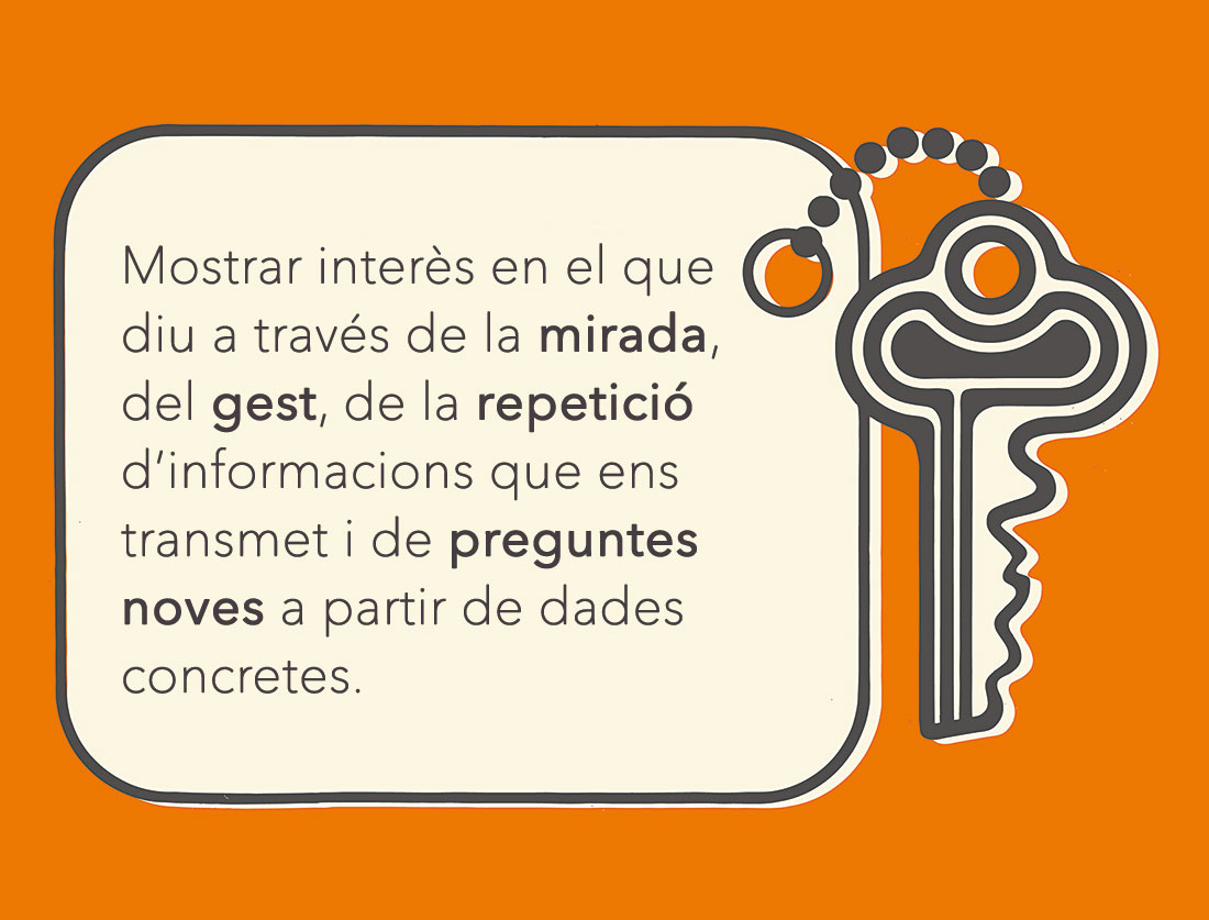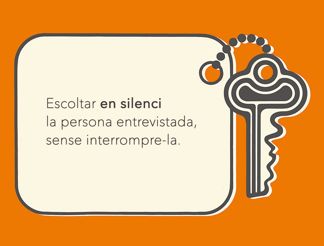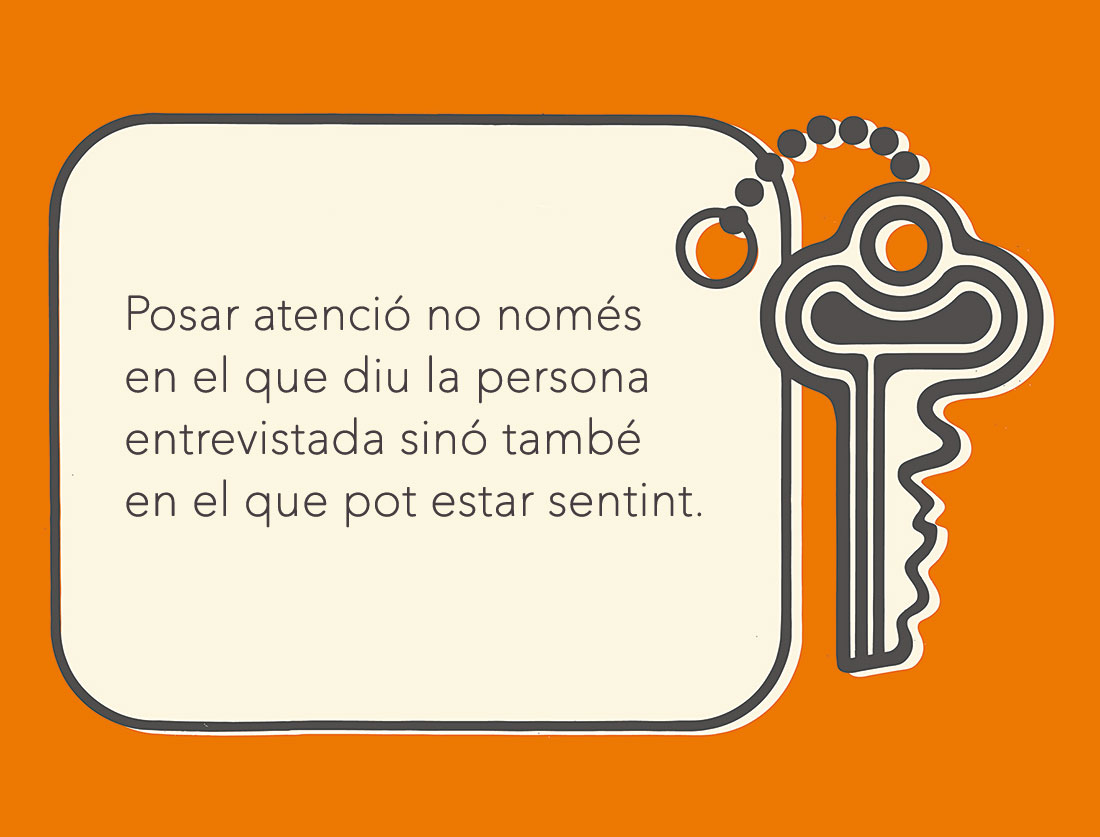 Un cop escrites les preguntes, organitzeu-vos per parelles i escolteu l’entrevista alhora que, per torns, hi incorporeu, quan correspongui, les preguntes que heu preparat.