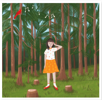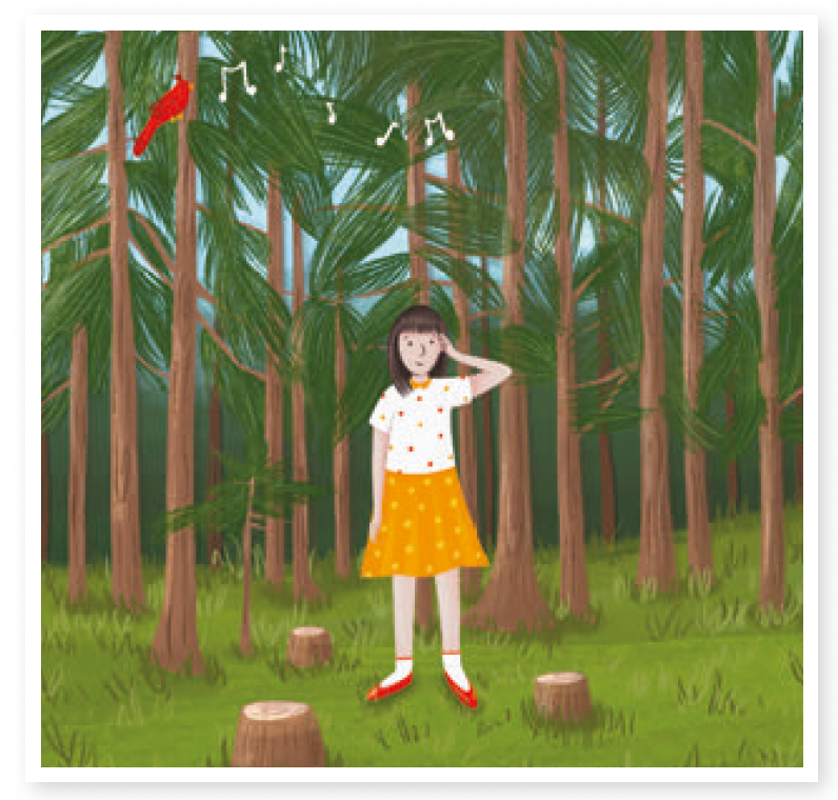 A little girl with a skirt and a T-shirt heard a bird in a fir tree in the forest. Where’s the fir tree with the bird the little girl heard?