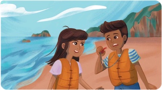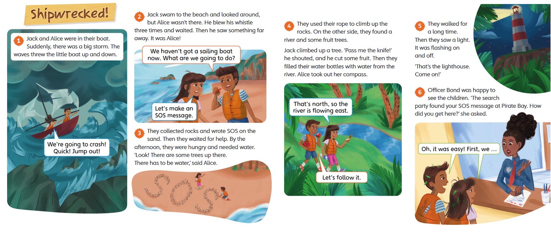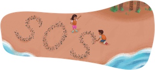 Our sailing boat smashed on some yesterday. There is a  behind the . We are OK, but we are and thirsty. We are going to stay here for four hours and then we are going to look for  and . Please send help.