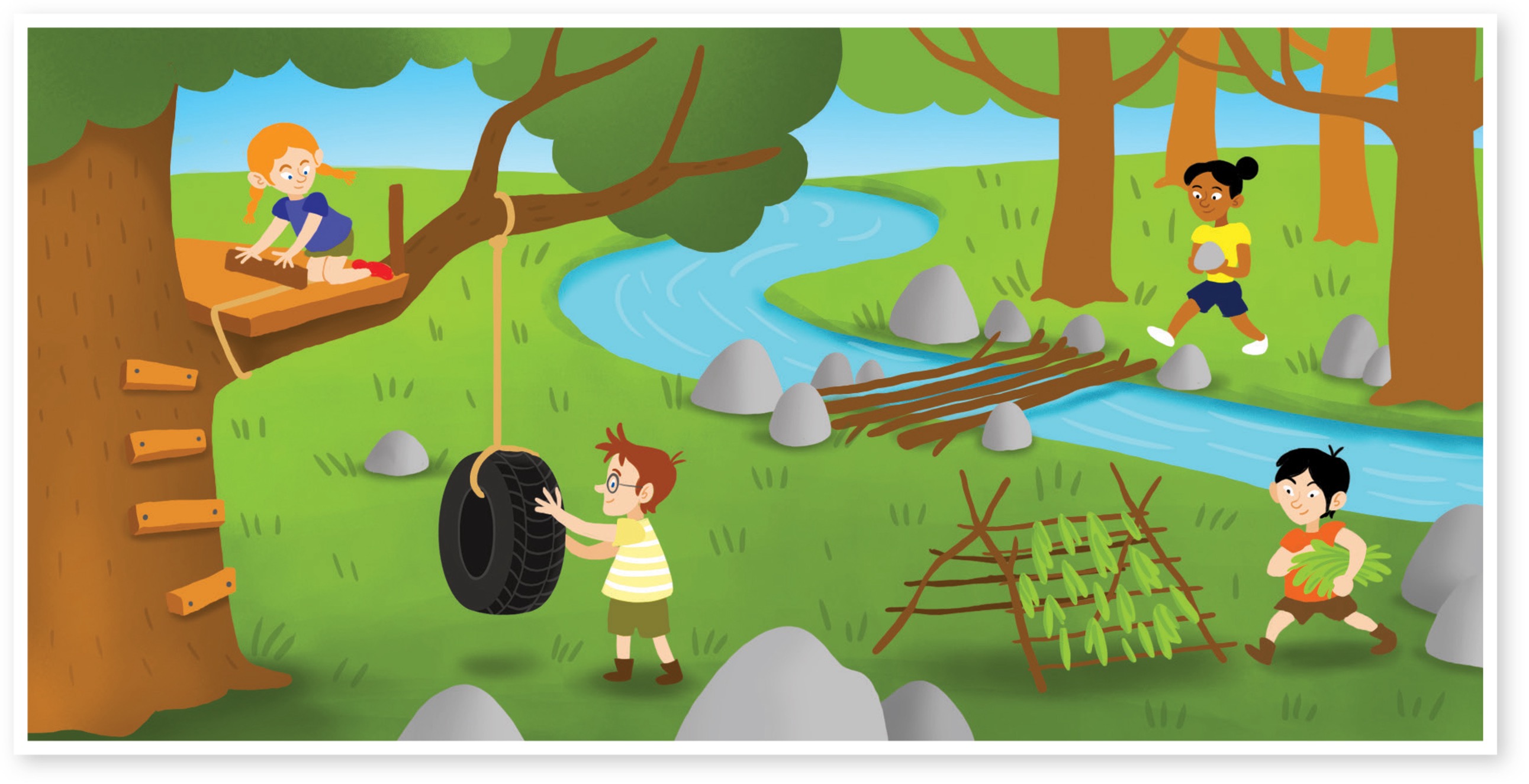 Playing outside is great! I really like climbing, swinging, collecting grass and leaves, and making a camp. I like balancing on branches, swimming and exploring. There are a lot of great things to do outside!