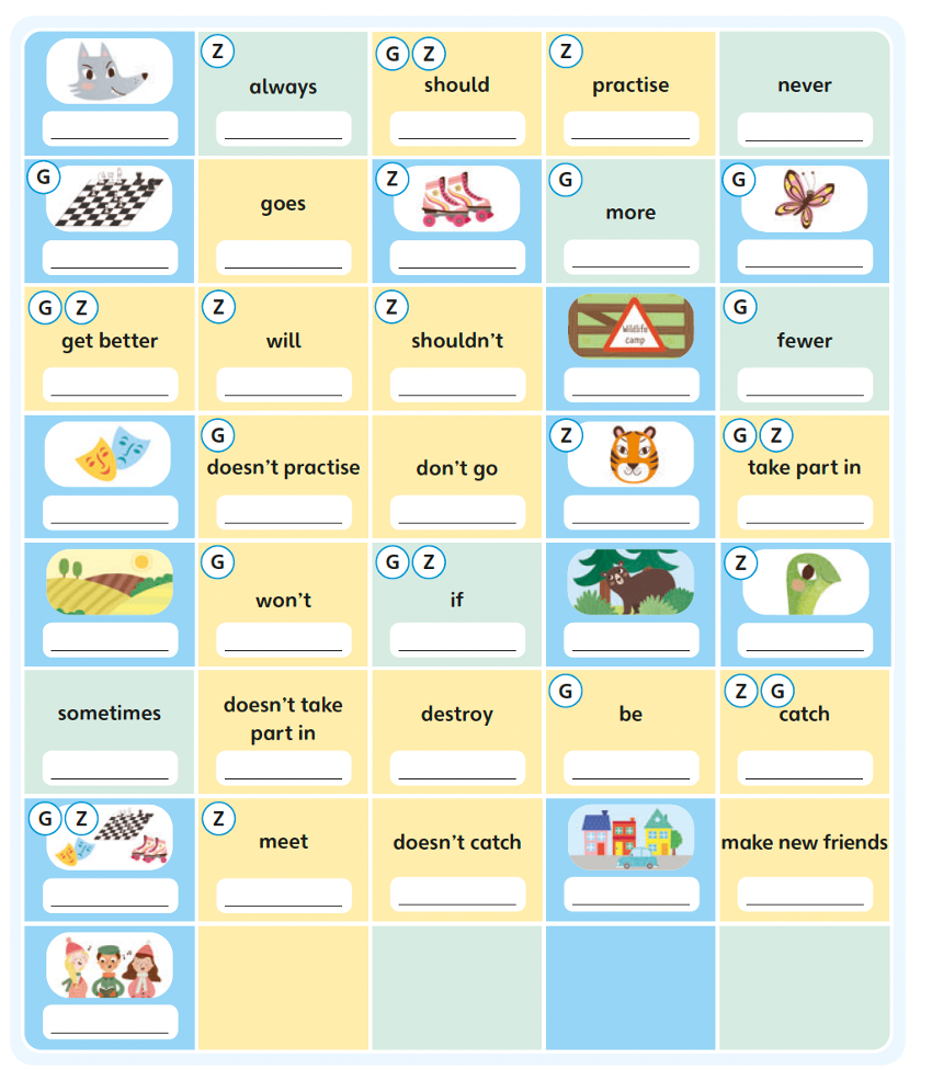 3 Complete the squares on the board. Then write a sentence.